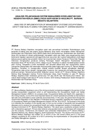 Handrian, R. Damanik and Neny, Sukmawatie and Neny, Fidayanti (2023) Analisis pelaksanaan Sistem Manajemen Keselamatan dan Kesehatan Kerja (SMK3) pada karyawan di Hauling PT. Barana Medayu Sejahtera. JTP (Jurnal Teknik Pertambangan), 23 (1): 8. pp. 48-52. ISSN 2087-1058