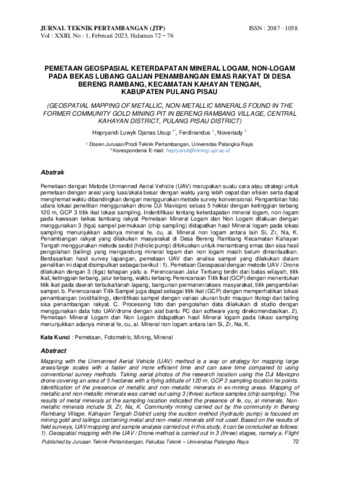 Pemetaan dengan Metode Unmanned Aerial Vehicle (UAV) merupakan suatu cara atau strategi untuk pemetaan dengan areal yang luas/skala besar dengan waktu yang lebih cepat dan efisien serta dapat menghemat waktu dibandingkan dengan menggunakan metode survey konvensional. Pengambilan foto udara lokasi penelitian menggunakan drone DJi Mavicpro seluas 5 hektar dengan ketinggian terbang 120 m, GCP 3 titik ikat lokasi sampling. Indentifikasi tentang keterdapatan mineral logam, non-logam pada kawasan bekas tambang rakyat Pemetaan Mineral Logam dan Non Logam dilakuan dengan menggunakan 3 (tiga) sampel permukaan (chip sampling) didapatkan hasil Mineral logam pada lokasi sampling menunjukkan adanya mineral fe, cu, al. Mineral non logam antara lain Si, Zr, Na, K. Penambangan rakyat yang dilakukan masyarakat di Desa Bereng Rambang Kecamatan Kahayan Tengah menggunakan metode sedot (hidrolic pump) difokuskan untuk menambang emas dan sisa hasil pengolahan (tailing) yang mengandung mineral logam dan non logam masih belum dimanfaatkan. Berdasarkan hasil survey lapangan, pemetaan UAV dan analisa sampel yang dilakukan dalam penelitian ini dapat disimpulkan sebagai berikut : 1). Pemetaan Geospasial dengan metode UAV / Drone dilakukan dengan 3 (tiga) tahapan yaitu a. Perencanaan Jalur Terbang terdiri dari batas wilayah, titik ikat, ketinggian terbang, jalur terbang, waktu terbang.Perencanaan Titik Ikat (GCP) dengan menentukan titik ikat pada daerah terbuka/tanah lapang, bangunan permanen/akses masyarakat, titik pengambilan sampel. b. Perencanaan Titik Sampel juga dapat sebagai titik ikat (GCP) dengan memperhatikan lokasi penambangan (void/tailing), identifikasi sampel dengan variasi ukuran butir maupun litologi dari tailing sisa penambangan rakyat. C. Processing foto dan pengolahan data dilakukan di studio dengan menggunakan data foto UAV/drone dengan alat bantu PC dan software yang direkomendasikan. 2). Pemetaan Mineral Logam dan Non Logam didapatkan hasil Mineral logam pada lokasi sampling menunjukkan adanya mineral fe, cu, al. Mineral non logam antara lain Si, Zr, Na, K.