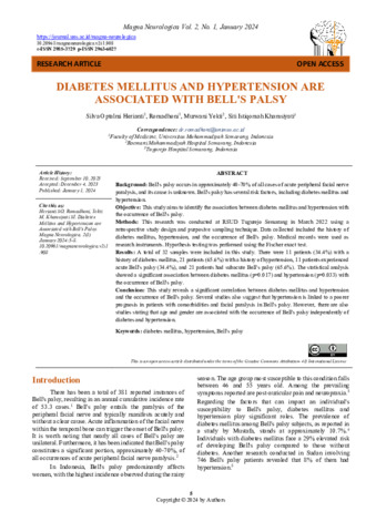 Silva Optalmi, Herianti and Romadhoni, Romadhoni and Murwani, Yekti and Siti Istiqomah, Khamsiyati (2024) Diabetes mellitus and hypertension are associated with Bell's palsy. Magna Neurologica, 2 (1): 2. pp. 6-9. ISSN 2963-6027