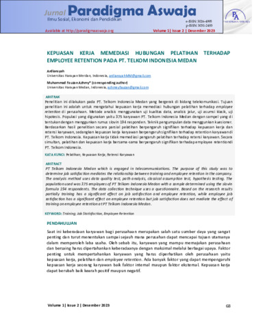 Ardiansyah, Ardiansyah and Muhammad Fauzan, Azhmy (2023) Kepuasan kerja memediasi hubungan pelatihan terhadap employee retention pada PT. Telkom Indonesia Medan. Jurnal Paradigma Aswaja: Sosial, Ekonomi, Pendidikan, 1 (2): 2. pp. 68-78. ISSN 3031-2493