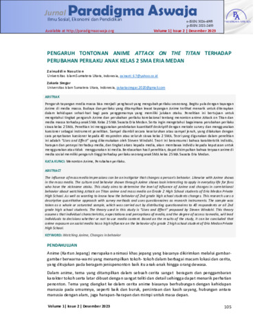 Zainuddin, Nasution and Zakaria, Siregar (2023) Pengaruh tontonan anime "Attack on the Titan" terhadap perubahan perilaku anak kelas 2 SMA Eria Medan. Jurnal Paradigma Aswaja: Sosial, Ekonomi, Pendidikan, 1 (2): 6. pp. 105-111. ISSN 3031-2493