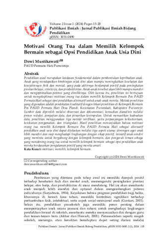 Dewi, Mustikawati (2024) Motivasi orang tua dalam memilih kelompok bermain sebagai opsi pendidikan anak usia dini. Publikasi Ilmiah: Jurnal Publikasi Ilmiah, 2 (1): 3. pp. 15-20. ISSN 3031-0490
