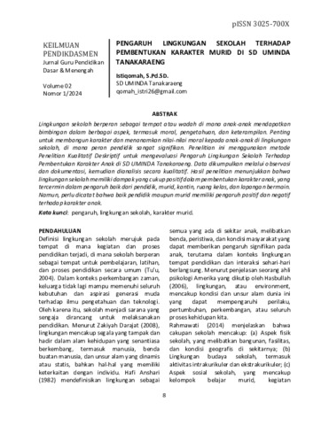 Istiqomah, Istiqomah (2024) Pengaruh lingkungan sekolah terhadap pembentukan karakter murid di SD UMINDA Tanakaraeng. Keilmuan Pendikdasmen: Jurnal Guru Pendidikan Dasar dan Menengah, 2 (1): 2. pp. 8-13. ISSN 3025-700X