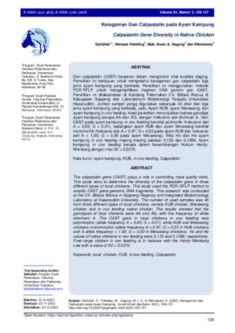 Gen calpastatin (CAST) berperan dalam mengontrol sifat kualitas daging. Penelitian ini bertujuan untuk mengetahui keragaman gen calpastatin tiga jenis ayam kampung yang berbeda. Penelitian ini menggunakan motode PCR-RFLP untuk mengamplifikasi fragmen DNA genom gen CAST. Penelitian ini dilaksanakan di Kandang Peternakan CV. Bittara Wanua di Kabupaten Soppeng dan Laboratorium Bioteknologi Terpadu Universitas Hasanuddin. Jumlah sampel yangg digunakan sebanyak 45 ekor dari tiga jenis ayam kampung yang berbeda, yaitu Ayam KUB, ayam Merawang, dan ayam kampung in ovo feeding. Hasil penelitian menunjukkan bahwa genotipe ayam kampung berupa AA dan AG, dengan frekuensi alel dominan A. Gen CAST pada ayam kampung in ovo feeding bersifat polimorfik (frekuensi alel A = 0,93; G = 0,07), sedangkan ayam KUB dan ayam Merawang bersifat monomorfik (frekuensi alel A = 0,97; G = 0,03 pada ayam KUB dan frekuensi alel A = 1,00; G = 0,00 pada ayam Merawang). Nilai Ho dan He ayam kampung in ovo feeding masing-masing sebesar 0,133 dan 0,1289. Ayam kampung in ovo feeding berada dalam keseimbangan Hukum Herdy-Weinberg dengan nilai X2 = 0,0370