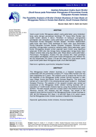 Musram, Abadi and Hairil A., Hadini and Haslin, Haslin (2023) Analisis kelayakan usaha ayam broiler (studi kasus pada Peternakan Wenggoasa di Kecamatan Konda Kabupaten Konawe Selatan). Jurnal Ilmiah AgriSains, 24 (3): 3. pp. 138-148. ISSN 1412-3657