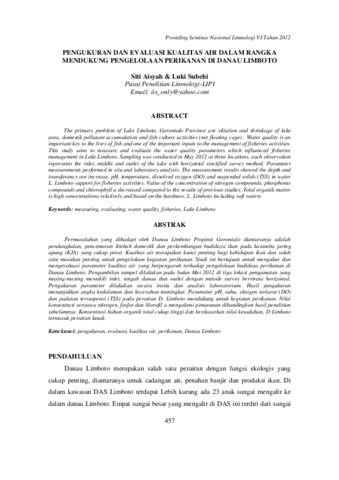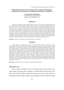 Siti, Aisyah and Luki, Subehi (2012) Pengukuran dan evaluasi kualitas air dalam rangka mendukung pengelolaan perikanan di Danau Limboto. In: Prosiding Seminar Nasional Limnologi VI, 16 Juli 2012, IPB International Convention Center.