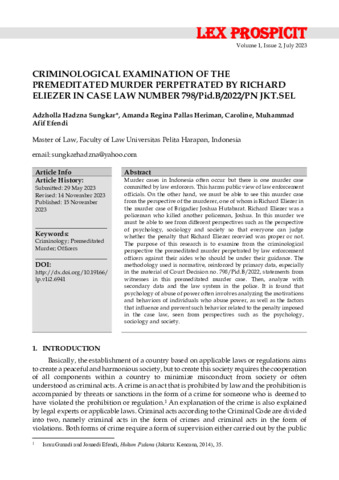 Adzholla, Hadzna Sungkar and Amanda, Regina Pallas Heriman and Caroline, Caroline and Muhammad, Afif Efendi (2023) Criminological examination of the premeditated murder perpetrated by Richard Eliezer in case law number 798/Pid.B/2022/PN JKT.SEL. Lex Prospicit, 1 (2): 3. pp. 109-119. ISSN 2988-1781