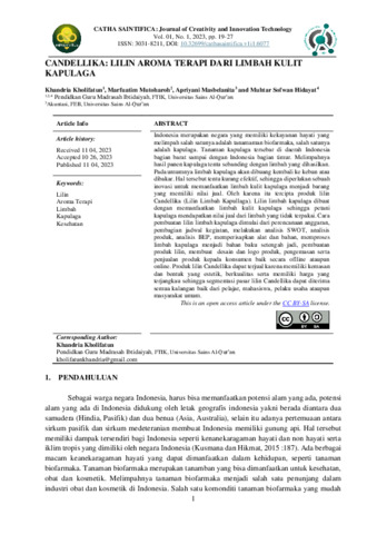 Khandria, Kholifatun and Marfuatim, Mutoharoh and Apriyani, Masbelanita and Muhtar Sofwan, Hidayat (2023) Candellika: lilin aroma terapi dari limbah kulit kapulaga. Catha Saintifica: Journal of Creativity and Inovation Technology, 1 (1): 3. pp. 19-27. ISSN 3031-8211