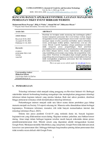 Muhammad Restu, Prayoga and Rifig, Al Wafaa and Ahmad, Ma’ruf and Hidayatus, Sibyan (2023) Rancang bangun aplikasi eventree: layanan manajemen pemesanan tiket event berbasis website. Catha Saintifica: Journal of Creativity and Inovation Technology, 1 (1): 7. pp. 51-60. ISSN 3031-8211