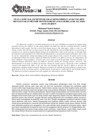 Metode montessori merupakan metode yang dilaksanakan dilingkungan anak usia dini, dengan penerapan praktik aktivitas anak. Agar anak usia dini bisa memikirkan, merasakan dan melakukan segala sesuatu sendiri tanpa bergantung orang lain. Seperti halnya manusia yang baru lahir bagaikan kertas putih dan apapun yang mewarnainya maka akan menjadi warna yang membekas dihidupnya. Penanaman nilai kemandirian sejak dini dirasa sangat vital dalam pelaksanaanya. Karena dengan ditanamkannya nilai tersebut dalam usia dini, akan membuatnya terbiasa dan melekat dalam diri anak itu sendiri. Kemandirian merupakan aspek penting bagi hidupnya kelak dimasa depan agar bisa hidup mandiri tanpa bergantung kepada orang lain. Berdasarkan dalam penelitian penulis akan berusaha menggali informasi tentang Bagaimana guru menerapkan metode montessori dalam upaya meningkatkan kemandirian anak usia dini. Dengan menggunakan penelitian kualitatif, dengan desain penelitian studi kasus. Metode Pengumpulan data diperoleh melalui lembar observasi aktivitas anak selama proses pembelajaran, wawancara dan dokumentasi berupa foto kegiatan selama proses tindakan. Peneliti telah melakukan penelitian dan menganalisis data, pada akhirnya dapat mengambil kesimpulan bahwa: upaya guru dalam meningakatkan kemandirian anak usia dini mengguakan metode montessori di Sanggar Belajar All Kids dikategorikan baik karena dengan adanya aspek kurikulum, aspek metode, aspek media, aspek model dan strategi metode montessori yang memadai dan sangat mendukung kemandirian anak usia dini.