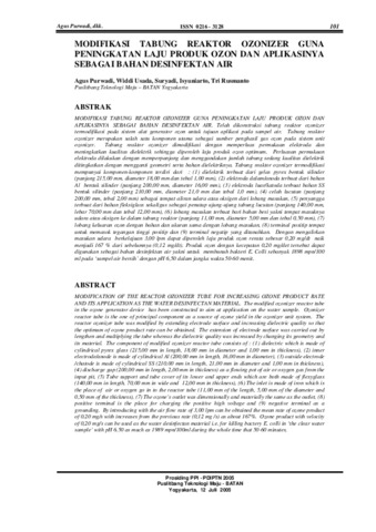MODIFIKASI TABUNG REAKTOR OZONIZER GUNA PENINGKATAN LAJU PRODUK OZON DAN APLIKASINYA SEBAGAI BAHAN DESINFEKTAN AIR. Telah dikonstruksi tabung reaktor ozonizer termodifikasi pada sistem alat generator ozon untuk tujuan aplikasi pada sampel air. Tabung reaktor ozonizer merupakan salah satu komponen utama sebagai sumber penghasil gas ozon pada sistem unit ozonizer. Tabung reaktor ozonizer dimodifikasi dengan memperluas permukaan elektroda dan meningkatkan kualitas dielektrik sehingga diperoleh laju produk ozon optimum. Perluasan permukaan elektroda dilakukan dengan memperpanjang dan menggandakan jumlah tabung sedang kualitas dielektrik ditingkatkan dengan mengganti geometri serta bahan dielektriknya. Tabung reaktor ozonizer termodifikasi mempunyai komponen-komponen terdiri dari : (1) dielektrik terbuat dari gelas pyrex bentuk silinder (panjang 215,00 mm, diameter 18,00 mm dan tebal 1,00 mm), (2) elektroda dalam/anoda terbuat dari bahan Al bentuk silinder (panjang 200,00 mm, diameter 16,00 mm), (3) elektroda luar/katoda terbuat bahan SS bentuk silinder (panjang 210,00 mm, diameter 21,0 mm dan tebal 1,0 mm), (4) celah lucutan (panjang 200,00 mm, tebal 2,00 mm) sebagai tempat aliran udara atau oksigen dari lobang masukan, (5) penyangga terbuat dari bahan fleksiglass sekaligus sebagai penutup ujung-ujung tabung lucutan (panjang 140,00 mm, lebar 70,00 mm dan tebal 12,00 mm), (6) lobang masukan terbuat bari bahan besi yakni tempat masuknya udara atau oksigen ke dalam tabung reaktor (panjang 11,00 mm, diameter 5,00 mm dan tebal 0,50 mm), (7) lobang keluaran ozon dengan bahan dan ukuran sama dengan lobang masukan, (8) terminal positip tempat untuk memasok tegangan tinggi positip dan (9) terminal negatip yang ditanahkan. Dengan mengalirkan masukan udara berkelajuan 3,00 lpm dapat diperoleh laju produk ozon rerata sebesar 0,20 mg/dt naik menjadi 167 % dari sebelumnya (0,12 mg/dt). Produk ozon dengan kecepatan 0,20 mg/det tersebut dapat digunakan sebagai bahan desinfektan air yakni untuk membunuh bakteri E. Colli sebanyak 1898 mpn/100 ml pada ‘sampel air bersih’ dengan pH 6,50 dalam jangka waktu 50-60 menit.