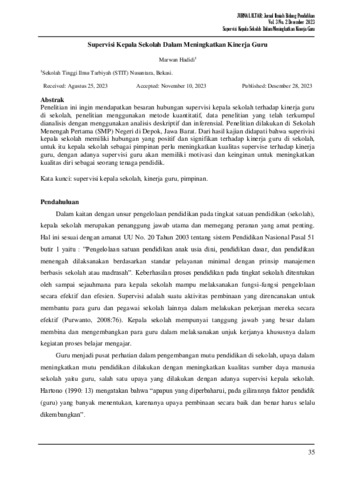 Marwan, Hadidi (2023) Supervisi kepala sekolah dalam meningkatkan kinerja guru. Jurnal Iltar: Jurnal Ilmiah Bidang Pendidikan, 3 (2): 4. pp. 35-43. ISSN 2657-0394
