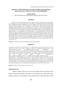 Budidaya semi intensif ditandai padat tebar rendah dan pakan sebagian masih mengandalkan alam sehingga biaya operasional pakan berkurang akhirnya usaha budidaya lebih efisien. Pendederan ikan pelangipelangi kurumoi (Melanotaenia parva) dilakukan pada wadah jaring berwarna hijau sebanyak 12 buah berukuran 1x1x1 m kedalaman air sekitar 60 cm yang diletakan di kolam tanah. Sebelumnya kolam dipupuk kotoran ayam dengan dosis 25 kg/25 m 3. Ikan uji yang digunakan ikan pelangipelangi kuromoi berumur sekitar 1 bulan berukuran panjang total 1,74 cm, panjang standar 1,52 cm dan berat 0,0575 g. Ikan ditebar dengan padat yang berbeda sekaligus sebagai perlakuan adalah sebagai berikut : A. 50 ekor/wadah, B. 80 ekor/wadah, C. 110 ekor/wadah dan D. 140 ekor/wadah. Selama satu bulan ikan tidak diberi pakan dan pakan hanya mengandalkan dari pakan alami yang ada di kolam, selanjutnya ikan diberi pakan berupa pelet apung dengan kandungan protein sekitar 35%. Pakan pellet diberikan sebanyak 3% dari berat badan dan frekuensi pemberian 2 kali sehari yaitu pagi pukul 09:00 dan sore pukul 15:30. Selama penelitian parameter yang diamati adalah pertumbuhan, sintasan dan kualitas air. Hasil penelitian menunjukkan bahwa padat tebar yang terbaik adalah 110 ekor /wadah dengan rata-rata bobot ikan 0,47 g, panjang total 3,24 cm, panjang standart 2,72 dan sintasan 97,67 %