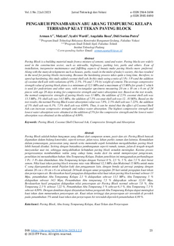 Arman, A and Mulyati, Mulyati and Syafri, Wardi and Angelalia, Roza and Didi, Sorina Putra (2023) Pengaruh penambahan abu arang tempurung kelapa terhadap kuat tekan paving block. Jurnal Teknologi dan Vokasi, 1 (2): 3. pp. 23-30. ISSN 2985-8690
