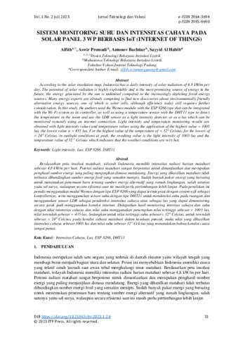 Alfith, Alfith and Aswir, Premadi and Antonov, Bachtiar and Sayyid, Al Habib (2023) Sistem monitoring suhu dan intensitas cahaya pada solar panel 3 WP berbasis IoT (Internet of Things). Jurnal Teknologi dan Vokasi, 1 (2): 4. pp. 31-38. ISSN 2985-8690