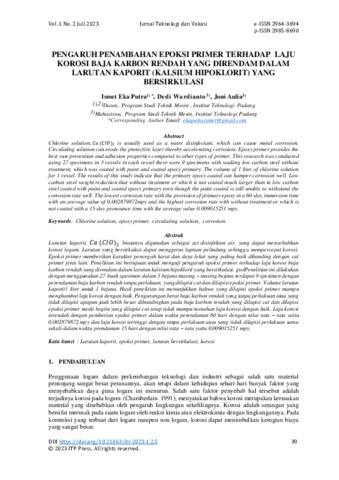 Ismet, Eka Putra and Dedi, Wardianto and Joni, Aulia (2023) Pengaruh penambahan epoksi primer terhadap laju korosi baja karbon rendah yang direndam dalam larutan kaporit (kalsium hipoklorit) yang bersirkulasi. Jurnal Teknologi dan Vokasi, 1 (2): 5. pp. 39-45. ISSN 2985-8690