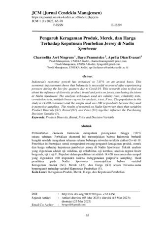 Charmelita, Asri Ningrum and Bayu Bayu Pramutoko, Bayu Pramutoko and Aprilia, Dian Evasari (2023) Pengaruh keragaman produk, merek, dan harga terhadap keputusan pembelian jersey di Nadin Sportwear. Jurnal Cendekia Manajemen, 1 (1): 6. pp. 65-78. ISSN 3031-9846