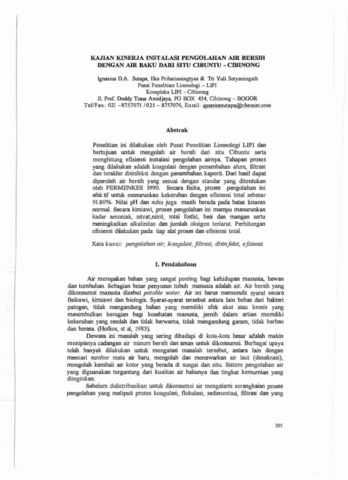 Jgnasius, D.A. Sutapa and Eka, Prihatinningtyas and Tri, Yuli Setyaningsih (2005) Kajian kinerja instalasi pengolahan air bersih dengan air baku dari Situ Cibuntu - Cibinong. Technical Report. Pusat Penelitian Limnologi, Bogor.