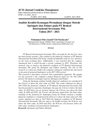 Dengan metode Springate dianggap kodisi keuangan yang sehat adalah jika S-Score diatas nilai batas 0,865. Hasil yang diperoleh adalah pada tahun 2017-2018 kodisi keuangan PT Bentoel Internasional Investama Tbk berpotensi mengalami kebangkrutan dikarenakan S-Score diabawah nilai batas. Pada tahun 2019 sempat mengalami perningkatan karena S-Score berada diatas nilai batas. Pada tahun 2020 dan 2021 mengalami penurunan kembali S-Score dibawah nilai batas sehingga berpotensi mengalami kebangkrutan. Dengan metode Fulmer dianggap kodisi keuangan yang sehat adalah jika H-Score diatas nilai batas 0. Hasil yang diperoleh adalah pada tahun 2017-2019 kodisi keuangan PT Bentoel Internasional Investama Tbk dikatakan sehat karenakan H-Score diatas nilai batas. Pada tahun 2020 dan 2021 mengalami penurunan H-Score dibawah nilai batas sehingga berpotensi mengalami kebangkrutan.