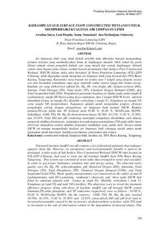 Awalina, Satya and Lani, Puspita and Senny, Sunanisari and Fachmijani, Sulawesty (2011) Kemampuan sub surface flow constructed wetland untuk memperbaiki kualitas air limpasan lindi. In: Prosiding Simposium Nasional Ekohidrologi, 24 Maret 2011, Gedung Widyagraha – LIPI Jakarta.