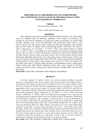 Lukman, Lukman (2011) Pertimbangan ciri hidrologi dan morfometri dalam penentuan daya dukung perairan Danau Toba untuk budidaya perikanan. In: Prosiding Simposium Nasional Ekohidrologi, 24 Maret 2011, Gedung Widyagraha – LIPI Jakarta.