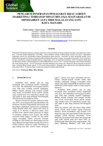 Fandy, Latuni and Seska, Gampu and Jourie, Pangemanan and Megawati, Panguleeng (2023) Pengaruh penerapan pemasaran hijau (green marketing) terhadap minat belanja masyarakat di Minimarket Alfa Midi Malalayang Satu Kota Manado. Global Science: The Journal of Research and Development, 4 (1): 3. pp. 19-24. ISSN 2808-7259