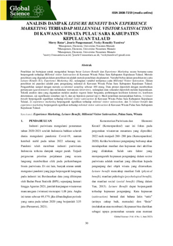 Merry, Ratar and Jourie, Pangemanan and Vecky, Renaldy Tumiwa (2023) Analisis dampak leisure benefit dan experience marketing terhadap millennial visitor satisfaction di Kawasan Wisata Pulau Sara Kabupaten Kepulauan Talaud. Global Science: The Journal of Research and Development, 4 (1): 5. pp. 30-34. ISSN 2808-7259