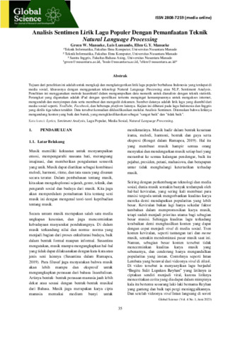 Green, W. Manueke and Luis, Lumando and Ellen, G.Y. Manueke (2023) Analisis sentimen lirik lagu populer dengan pemanfaatan teknik natural language processing. Global Science: The Journal of Research and Development, 4 (1): 6. pp. 35-42. ISSN 2808-7259