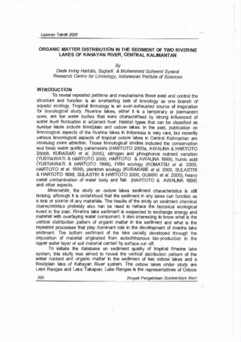 Dede, Irving Hartoto and Sugiarti, Sugiarti and Muhammad, Suhaemi Syawal (2001) Organic matter distribution in the sediment of two riverine lakes of Kahayan River, Central Kalimantan. Technical Report. Pusat Penelitian Limnologi, Bogor.