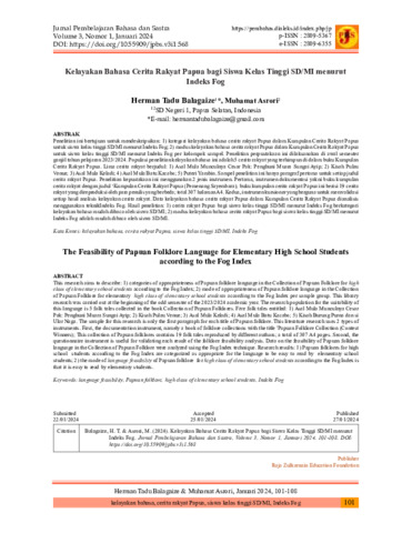 Herman, Tadu Balagaize and Muhamat, Asrori (2024) Kelayakan bahasa cerita rakyat Papua bagi siswa kelas tinggi SD/MI menurut indeks fog. Jurnal Pembelajaran Bahasa dan Sastra (Jurnal Pembahas), 3 (1): 10. pp. 101-108. ISSN 2809-5367