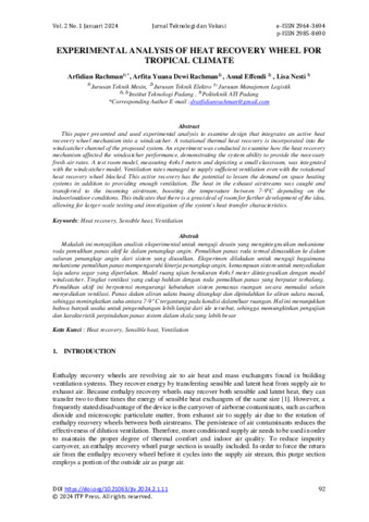 Arfidian, Rachman and Arfita, Yuana Dewi Rachman and Asnal, Effendi and Lisa, Nesti (2024) Experimental analysis of heat recovery wheel for tropical climate. Jurnal Teknologi dan Vokasi, 2 (1): 11. pp. 92-96. ISSN 2985-8690