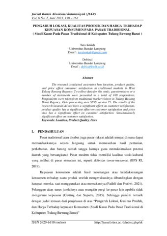 Tara, Ismiah and Defrizal, Defrizal (2023) Pengaruh lokasi, kualitas produk dan harga terhadap kepuasan konsumen pada pasar tradisional (studi kasus pada pasar tradisional di Kabupaten Tulang Bawang Barat). Jurnal Ilmiah Akuntansi Rahmaniyah, 6 (2): 1. 150 -163. ISSN 2620-6110