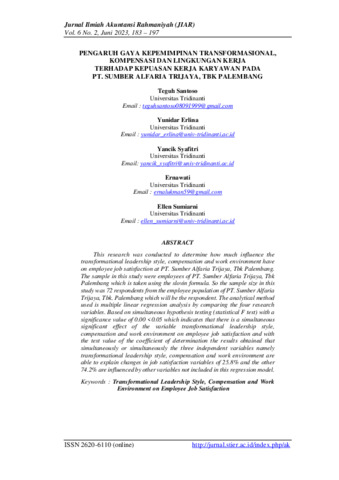 Teguh, Santoso and Yunidar, Erlina and Yancik, Syafitri and Ernawati, Ernawati and Ellen, Sumiarni (2023) Pengaruh gaya kepemimpinan transformasional, kompensasi dan lingkungan kerja terhadap kepuasan kerja karyawan pada PT. Sumber Alfaria Trijaya, Tbk. Palembang. Jurnal Ilmiah Akuntansi Rahmaniyah, 6 (2): 3. pp. 183-197. ISSN 2620-6110