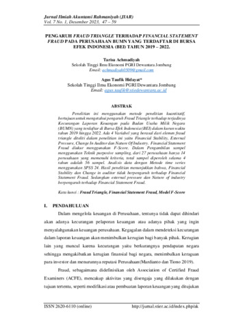 Tarisa, Achmadiyah and Agus, Taufik Hidayat (2023) Pengaruh fraud triangle terhadap financial statement fraud pada perusahaan BUMN yang terdaftar di Bursa Efek Indonesia (BEI) tahun 2019-2022. Jurnal Ilmiah Akuntansi Rahmaniyah, 7 (1): 4. pp. 47-59. ISSN 2620-6110