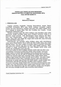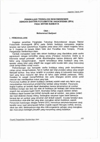 Kegiatan penelitian Pengkajian Teknologi Biokondisioner dengan Bakteri Fotosintetik Anoksigenik (BFA) pada Sistem budidaya merupakan kegiatan lanjutan dari tahun sebelumnya. Kegiatan pada tahun 2001 adalah kegiatan tahun ke 3. Kegiatan ini berada dalam tolok ukur Penelitian llmu Terapan, Proyek Pengelolaan Sumberdaya Alam. Tambak merupakan salah satu sistem budidaya yang diandalkan pada usaha agroindustri dengan komoditas udang windu (Penaeus monodon). Usaha ini di Indonesia sangat potensial untuk dikembangkan karena didukung oleh faktor faktor yang menguntungkan, seperti tersedianya lahan budidaya yang luas, spesies udang lokal yang adaptif dan unggul serta kondisi iklim yang menunjang untuk bereproduksi setiap musim. Perkembangan dan kemajuan usaha budidaya udang pada kenyataannya cukup cukup memprihatinkan, hal ini terlihat dari total produksi udang yang sangat fluktuatif bahkan lima tahun terakhir ini produksi udang di Indonesia menunjukan hasil yang terus menurun dari tahun ke tahun (data statistik perikanan, 1995). Keadaan ini sangat memprihatinkan dan perlu ditangani secara serius untuk mencari dan mendapatkan solusi yang baik. Penurunan kualitas air sistem budidaya (tambak) adalah salah satu faktor yang menyebabkan menurunnya produktivitas tambak udang tersebut. Penurunan tingkat kualitas air tambak dapat disebabkan karena tercemarnya air sumber budidaya (sungai dan laut) dan atau air budidaya (air tambak) oleh bahan-bahan organik dan senyawa logam berat. Akumulasi bahan organik didalam sistem budidaya dapat berasal dari limbah domestik asal air sumber, sisa pakan (pellet) dan hasil ekskresi (feces) udang. Sedangkan senyawa logam berat biasanya berasal dari air sumber yang tercemar oleh limbah industri. Kondisi tersebut akan menimbulkan efek-efek lain yang akan merugikan sistem budidaya, seperti Penurunan kandungan oksigen terlarut (DO), munculnya senyawa-senyawa yang bersifat racun hasil dekomposisi bahan organik seperti Hidrogen sulfida, amonia, nitrat dan nitrit. Melimpahnya alga atau mikroorganisme patogen yang merugikan dan munculnya berbagai penyakit yang menyerang udang budidaya.