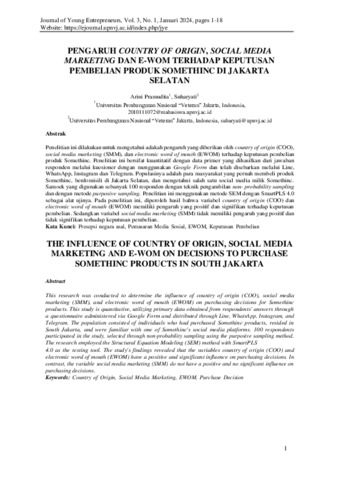 Arini, Pramudita and Suharyati, Suharyati (2024) Pengaruh country of origin, social media marketing dan E-WOM terhadap keputusan pembelian produk somethinc di Jakarta Selatan. Journal of Young Entrepreneurs, 3 (1): 1. pp. 1-18. ISSN 2964-8521