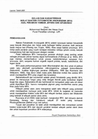 Muhammad, Badjoeri and Hasan, Fauzi (2001) Isolasi dan karakterisasi isolat Bakteri Fotosintetik Anoksigenik (BFA) asal perairan tambak Jepara dan Situbondo. Technical Report. Pusat Penelitian Limnologi, Bogor.