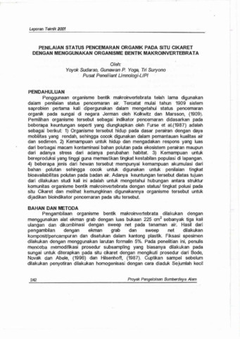 Yoyok, Sudarso and Gunawan, Pratama Yoga and Tri, Suryono (2001) Penilaian status pencemaran organik pada Situ Cikaret dengan menggunakan organisme bentik makroinvertebrata. Technical Report. Pusat Penelitian Limnologi, Bogor.