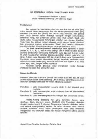 Djamhuriyah, S. Said and Hasan, Fauzi (2002) Uji fertilitas hibrida ikan pelangi Irian. Technical Report. Pusat Penelitian Limnologi, Bogor.