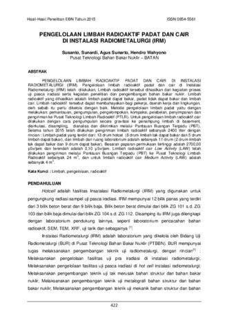 Susanto, Susanto and Sunardi, Sunardi and Sunarto, Agus and Wahyono, Hendro (2015) Pengelolaan Limbah Radioaktif Padat dan Cair Di Instalasi Radiometalurgi (IRM). Prosiding Seminar Hasil-hasil Penelitian EBN Tahun 2015, - (-). pp. 422-430. ISSN 0854-5561