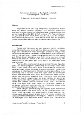 Pengolahan limbah tahu yang menggunakan Nymphaea sp (teratai kecil) dan Hydrilla verticillata (ganggeng) pada sederetan kolam-kolam percobaan berbentuk persegi telah dilakukan selama 3 bulan pada bulan Juli sampai dengan September 2002 di Puslit Limnologi-LIPI. Parameter kualitas air yang diamati adalah TN,TP, BOD, COD, pH, DO, suhu, dan turbiditas. Hasil pengamatan menunjukkan bahwa tanaman teratai kecil dan ganggeng mampu menyediakan lingkungan untuk proses penguraian limbah tahu