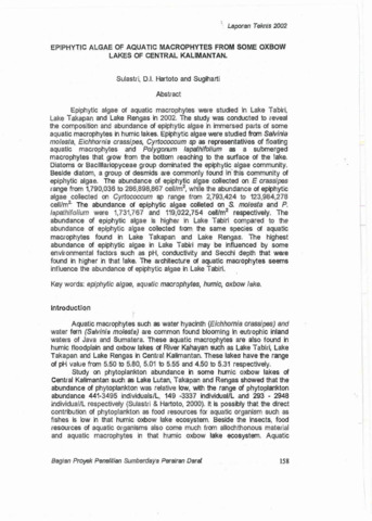 Sulastri, Sulastri and Dede, Irving Hartoto and Sugiarti, Sugiarti (2002) Epiphytic algae of aquatic macrophytes from some oxbow lakes of Central Kalimantan. Technical Report. Pusat Penelitian Limnologi, Bogor.