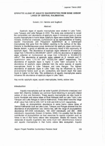 Epiphytic algae of aquatic macrophytes were studied in Lake Tabiri, Lake Takapan and Lake Rengas in 2002. The study was conducted to reveal the composition and abundance of epiphytic algae in immersed parts of some aquatic macrophytes in humic lakes. Epiphytic algae were studied from Salvinia molesta, Eichhornia crassipes, Cyrtococcum sp as representatives of floating aquatic macrophytes and Polygonum lapathifolium as a submerged macrophytes that grow from the bottom reaching to the surface of the lake. Diatoms or Bacilllariopyceae group dominated the epiphytic algae community. Beside diatom, a group of desmids are commonly found in' this community of epiphytic algae. The abundance of epiphytic algae collected on E crassipes range from 1,790,036 to 286,898,867 cell/m, while the abundance of epiphytic algae collected on Cyrtococcum sp range from 2,793,424 to 123,984,278 cell/m 2. The abundance of epiphytic algae colleted on S. molesta and P. lapathifolium were 1,731,767 and 119,022,754 cell/m respectively. The abundance of epiphytic algae is higher in Lake Tabiri compared to the abundance of epiphytic algae collected from the same species of aquatic macrophytes found in Lake Takapan and Lake Rengas. The highest abundance of epiphytic algae in Lake Tabiri may be influenced by some environmental factors such as pH, conductivity and Secchi depth that were found in higher in that lake. The architecture of aquatic macrophytes seems influence the abundance of epiphytic algae in Lake Tabiri.