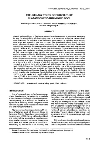 One of main problems in freshwater aquaculture development in Indonesia, especially in Java, is unavailability of developing zone. It is important to find an underutilized area that meets for industrial scale freshwater aquaculture, i.e. sufficient water supply, wide area, and located in one area or zone. The abandoned mining (sand, tin, etc.) pools distributed along the country might be the potential area for freshwater aquaculture business. For example, there are at least 13 water pools with total surface area of 250 ha at 15 km side of Citarum River in Karawang District (West Java Province). This study was conducted to obtain preliminary data about the prospect and potency of fish culture (tilapia, clariid catfish, and ‘patin’ catfish) in abandoned sand-mining pools in Karawang District. Mini floating net cages of 1 x 1 x 1.5 m3 size were used for culturing fish, i.e. patin catfish (Pangasianodon hypophthalmus), nile tilapia (Oreochromis niloticus), and clariid catfish (Clarias gariepinus), separately. Patin catfish were stocked at a size of 2 g with a density of 300 fish per cage, tilapia were stocked at a size of 6 g with a density of 400 fish per cage, while the clariid catfish were stocked at a size of 1.4 g with a density of 980 fish per cage. A floating commercial feed (30%—32% protein, 3%—5% fat) was used at a daily rate of 9% biomass weight at the beginning and reduced gradually to 3% at the final culture period. Observed data showed that patin catfish grew from the initial size of 2.08 g to the final size 299.59 g in 5 months, nile tilapia grew from individual initial size of 5.92 g to the final size of 247.12 g in 14 weeks, and clariid catfish grew from initial size of 1.39 g to the final size of 73.10 g in 8 weeks. These three species were technically prospective for aquaculture development in the abandoned sand-mining pools.