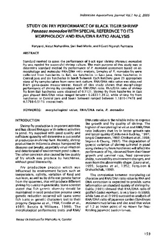 Haryanti, Haryanti and Ketut, Mahardika and Sari Budi, Moria and I Gusti Ngurah, Permana (2006) Study on fry performance of black tiger shrimp Penaeus monodon with special reference to its morphology and RNA/DNA ratio analysis. Indonesian Aquaculture Journal (IAJ), 1 (2): 10. pp. 159-164. ISSN 0215-0883