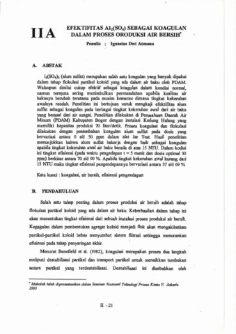 A1₂(SO₄) (alum sulfat) merupakan salah satu koagulan yang banyak dipakai dalam tahap flokulasi partikel koloid yang ada dalam air baku oleh PDAM. Walaupun dinilai cukup efektif sebagai koagulan dalam kondisi normal, namun ternyata sering menimbulkan permasalahan apabila kualitas air bakunya berubah terutama pada musim kemarau dimana tingkat kekeruhan awalnya rendah. Penelitian ini bertujuan untuk mengkaji efektifitas alum sulfat sebagai koagulan pada berbagai tingkat kekeruhan awal dari air baku yang berasal dari air sungai. Penelitian dilakukan di Perusahaan Daerah Air Minum (PDAM) Kabupaten Bogor dengan instalasi Kedung Halang yang memiliki kapasitas produksi 70 liter/detik. Proses koagulasi dan flokulasi dilakukan dengan penambahan koagulan alum sulfat pada dosis yang bervariasi antara O s/d 50 ppm dalam alat Jar Test. Hasil penelitian menunjukkan bahwa alum sulfat bekerja dengan baik sebagai koagulan apabila tingkat kekeruhan awal air baku berada di atas 15 NTU. Dalam kodisi ini tingkat efisiensi (pada waktu pengedapan t = 5 menit dan dosis optimal 30 ppm) berkisar antara 70 s/d 90 %. Apabila tingkat kekeruhan awal kurang dari 15 NTU maka tingkat efisiensi pengendapannya bervariasi antara 37 s/d 69 %.