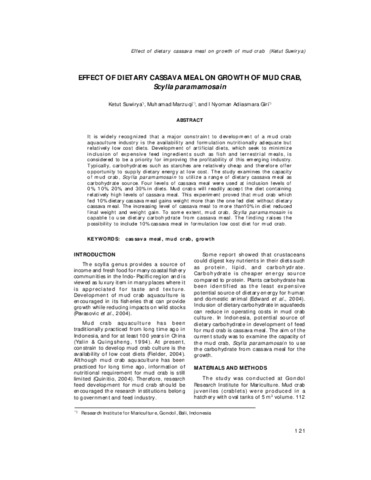 Ketut, Suwirya and Muhamad, Marzuqi and I Nyoman Adiasmara, Giri and G., Apriyana (2007) Effect of dietary cassava meal on growth of mud crab, Scylla paramamosain. Indonesian Aquaculture Journal (IAJ), 2 (2): 6. pp. 121-125. ISSN 0215-0883