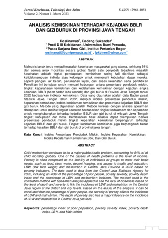 Roslinawati, Roslinawati and Dadang, Sukandar (2023) Analisis kemiskinan terhadap kejadian BBLR dan gizi buruk di provinsi Jawa Tengah. Jurnal Kesehatan, Teknologi, dan Sains, 2 (1): 1. pp. 1-11. ISSN 2964-4054
