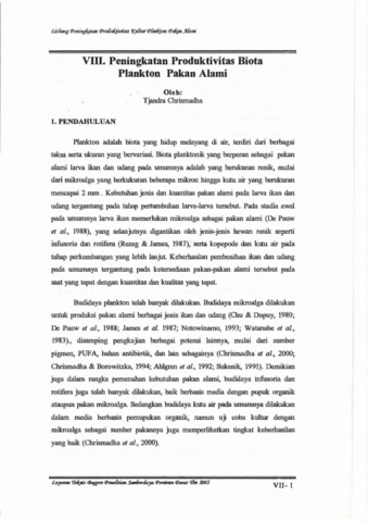 Plankton adalah biota yang hidup melayang di air, terdiri dari berbagai taksa serta ukuran yang bervariasi. Biota planktonik yang berperan sebagai pakan alami larva ikan dan udang pada umumnya adalah yang berukuran renik, mulai dari rnikroalga yang berkukuran beberapa rnikron hingga kutu air yang berukuran mencapai 2 mm. Kebutuhan jenis dan kuantitas pakan alami pada larva ikan dan udang tergantung pada tahap pertumbuhan larva-larva tersebut. Pada stadia awal pada umumnya larva ikan memerlukan mikroalga sebagai pakan alami (De Pauw et al., 1988), yang selanjutnya digantikan oleh jenis-jenis hewan renik seperti infusoria dan rotifera (Rezeg & James, 1987), serta kopepode dan kutu air pada tahap perkembangan yang lebih lanjut. Keberhasilan pembenihan ikan dan udang pada umumnya tergantung pada ketersediaan pakan-pakan alami tersebut pada saat yang tepat dengan kuantitas dan kualitas yang tepat.