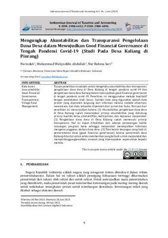 Nurindah, Nurindah and Muhammad, Wahyuddin Abdullah and Nur, Rahma Sari (2023) Mengungkap akuntabilitas dan transparansi pengelolaan dana desa dalam mewujudkan good financial governance di tengah pandemi Covid-19 (studi pada desa Kaliang di Pinrang). Indonesian Journal of Taxation and Accounting, 1 (1): 2. pp. 9-24. ISSN 2988-4896